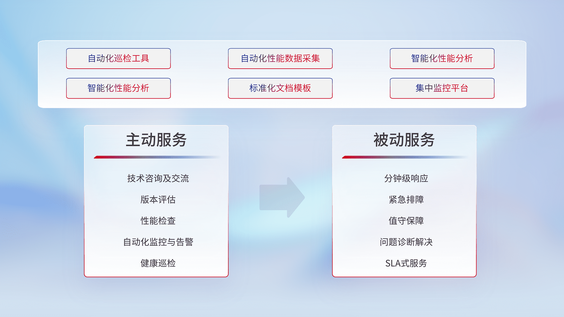 智能化工具和标准化文档,,保障服务质量,,,,提供主动服务(包含技术咨询、、、版本评估、、性能检查、、、、自动化监控与告警、、健康巡检)和被动服务包含(分钟级响应、、、紧急排障、、值守保障、、、问题诊断解决、、、SLA服务)。。。